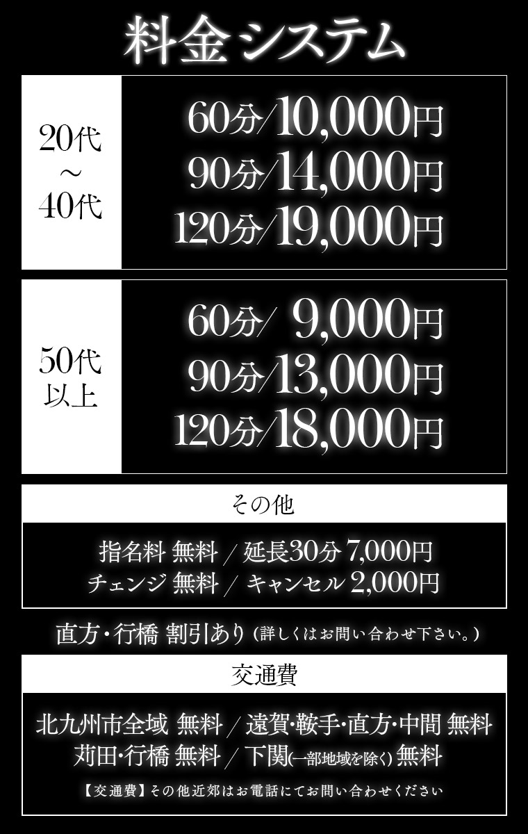お客様により楽しんでいただけるよう、年代別料金システムを導入。さらに、オールタイムオールコースで最大5,000円引きとなるお得なプランもご用意しております。また、ご指名料は無料となっており、ネット指名も含めて追加料金は一切かかりません。北九州全域をはじめ、遠賀・鞍手・中間・直方・行橋・下関エリアまで交通費も無料でご利用いただけます。(一部地域を除く)